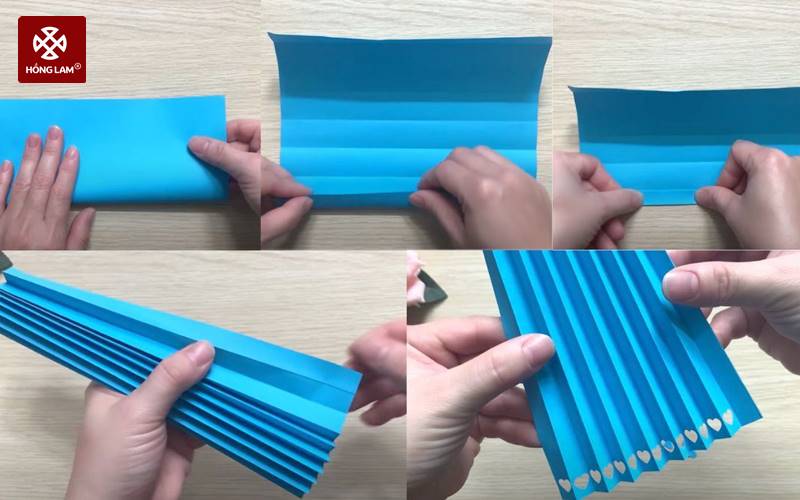 Bước 1: Bạn gấp tờ giấy 18x20cm làm đôi rồi gấp thành những đường nhỏ với khoảng cách bằng nhau như gấp quạt giấy. Sau đó, dùng dụng cụ đục lỗ hình trái tim và bấm đều ở hai đầu của tờ giấy.