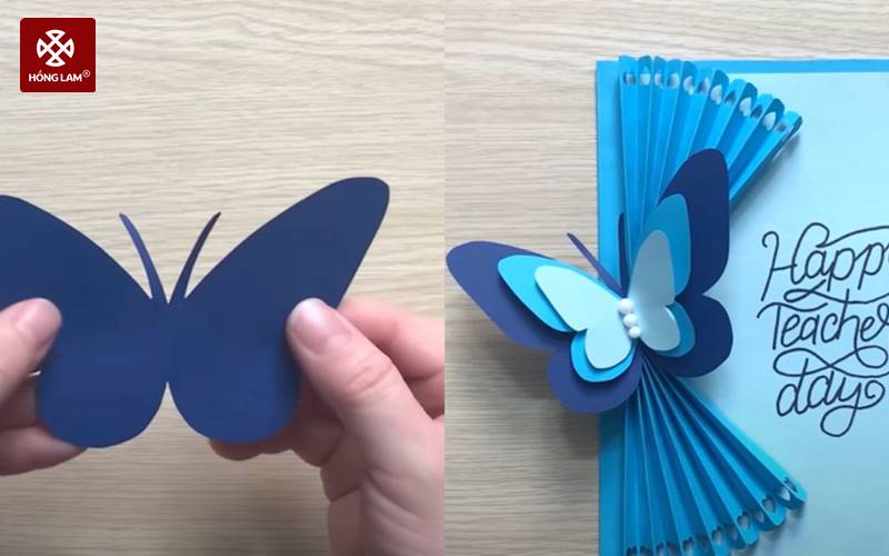 Bước 3: Tiếp tục gấp đôi tờ giấy 12x9cm, vẽ hình bướm và cắt ra. Thực hiện tương tự cách làm thiệp 20/11 này với giấy 10x7cm và 7x6cm. Sau đó, bạn dán chúng lại với nhau và dán vào thiệp như trong hình bên dưới.