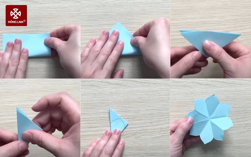 Bước 4: Bạn gấp đôi tờ giấy 9x9cm thành hình hoa như hướng dẫn bên dưới.