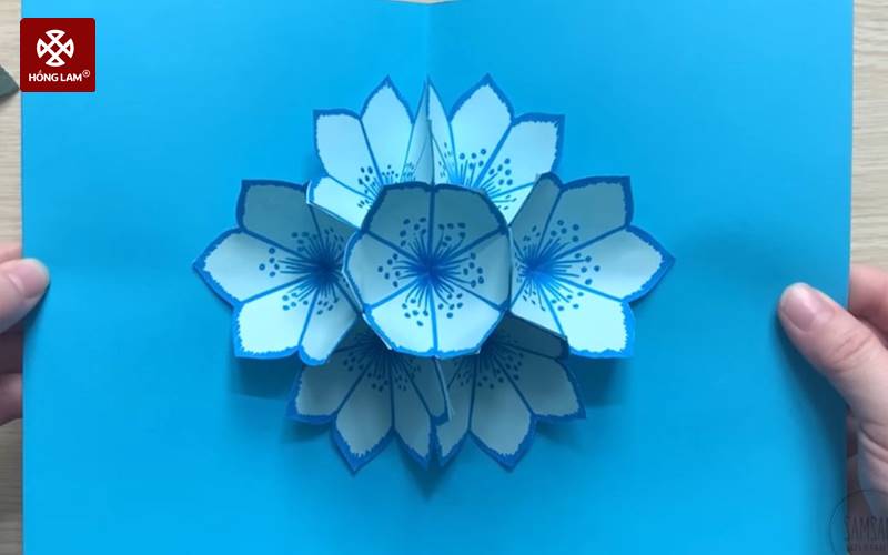 Bước 5: Bạn gấp thêm 6 hình bông hoa tương tự như vậy rồi dán chúng lại với nhau. Sau đó, bạn dán vào trang giữa của tấm thiệp. Vậy là bạn đã làm thiệp 20/11 3D thành công.