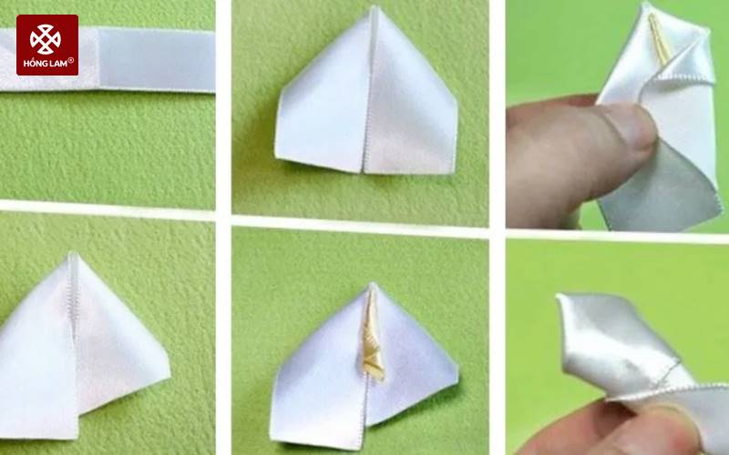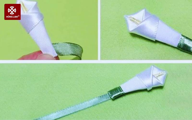 Bước 2: Bạn làm cách hoa với dây ruy băng rộng 2,5cn và dài 11cm. Thoa keo ở đầu ruy băng và gấp lại để có được hình cánh hoa. Bạn dùng một dây ruy băng màu xanh lá cây, quấn quanh phần đuôi để tạo cuốn hoa khi làm thiệp 20/11.