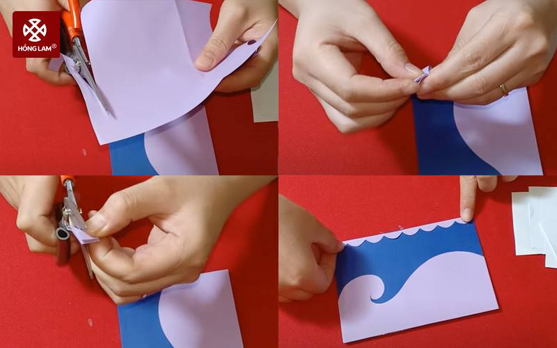 Bước 2: Với phần giấy tím còn dư, bạn cắt lấy 1 phần với kích thước 15cm x 2cm. Bạn gấp đôi giấy 3 lần rồi cắt hình cánh cung. Sau khi cắt xong bạn mở phần giấy đó ra, dùng keo giấy khô để dán nó vào bên trái của mặt ngoài tấm thiệp.