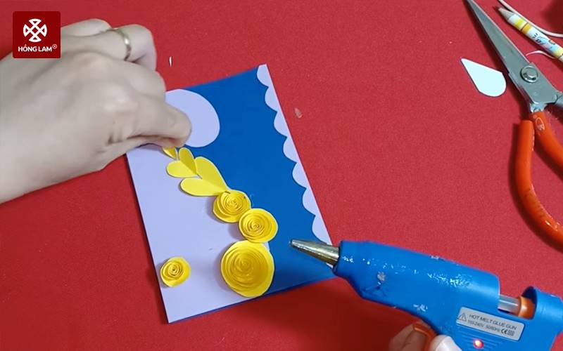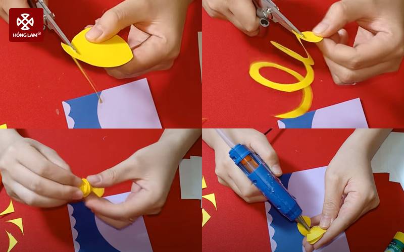 Bước 3: Bạn cắt giấy màu vàng thành hình tròn có đường kính 10cm, sau đó cắt nó thành mảnh giấy dài có bề ngang 1cm. Cắt xong bạn cuộn mảnh giấy lại để tạo hình bông hoa. Dùng súng bắn keo và keo nến để cố định phần chân của bông hoa. Tiếp tục làm tương tự để tạo 3-4 bông hoa khác (kích thước khác nhau).
