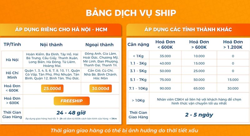 | Đơn hàng dưới 600.000đ | Đơn hàng từ 600.000đ trở lên | |