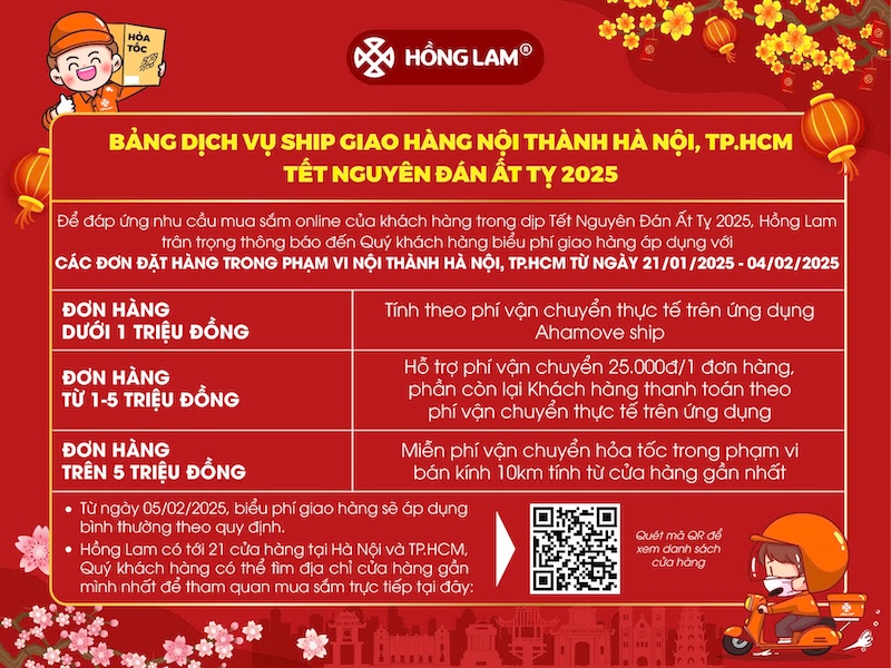 Để đáp ứng nhu cầu mua sắm online tăng cao của khách hàng trong dịp Tết Nguyên Đán Ất Tỵ 2025, Hồng Lam trân trọng thông báo đến Quý khách hàng biểu phí giao hàng áp dụng với các đơn đặt hàng trong phạm vi nội thành Hà Nội, TP.HCM từ ngày 21/01/2025 - 04/02/2025: