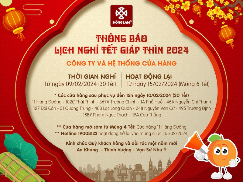 Kính chúc Quý khách hàng nhiều sức khỏe, hạnh phúc, thành công và thịnh vượng. Hồng Lam trân trọng thông báo lịch nghỉ Tết m lịch 2024 như sau: