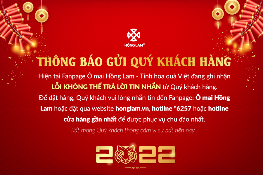 Từ ngày 5/01/2022, fanpage "Ô mai Hồng Lam - Tinh hoa quà Việt" đang bị lỗi không thể trả lời được tin nhắn từ Quý khách hàng. Do vậy, Quý khách hàng đặt hàng vui lòng gọi trực tiếp số holine *6257, fanpage