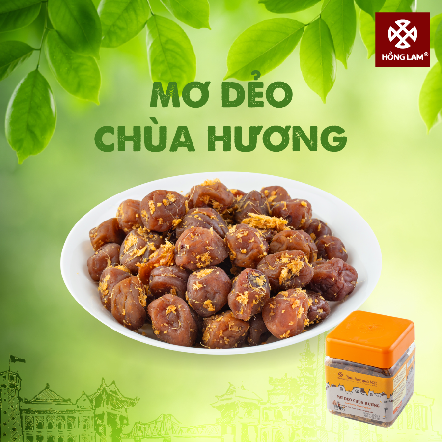 Mơ dẻo Chùa Hương là một trong những sản phẩm tiêu biểu nhất của ô mai Hồng Lam. Vị chua dịu và hương thơm đậm đà của những trái mơ hòa quyện với độngọt của đường,vị mặn của muối biển và thêm một chút cay nồng của gừng tạo nên sản phẩm đặc trưng nổi tiếng chỉ có ởHồng Lam.